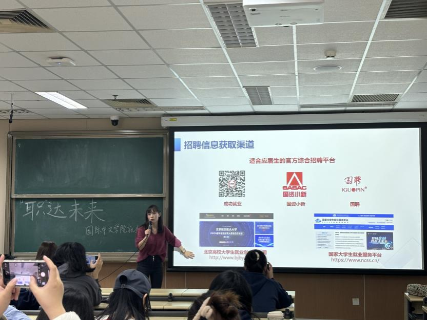 第三部分,招聘信息渠道。梅老师向同学们展示了北语就业创业、北京语言大学就业创业信息网、国务院国有资产监督管理委员会招聘专题板块等丰富的招聘信息网站,助力同学们更好更快地了解到就业相关信息,打破信息差,顺利找到心仪的工作。