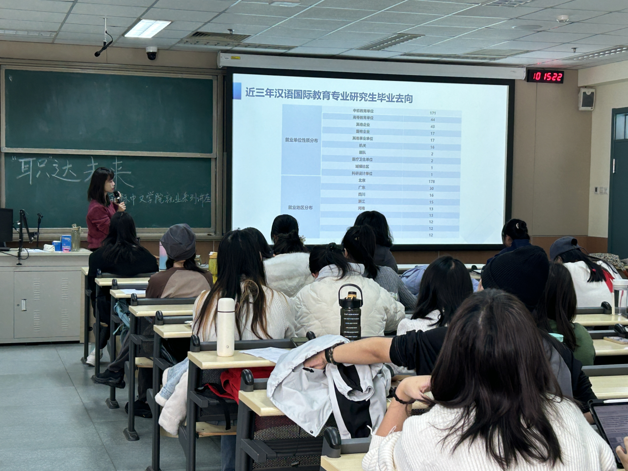 第一部分,梅老师用丰富的数据,从毕业人数、去向情况、就业单位、就业地区和就业行业类型等角度直观地向同学们展示和分析近三年汉语国际教育专业研究生毕业去向情况。