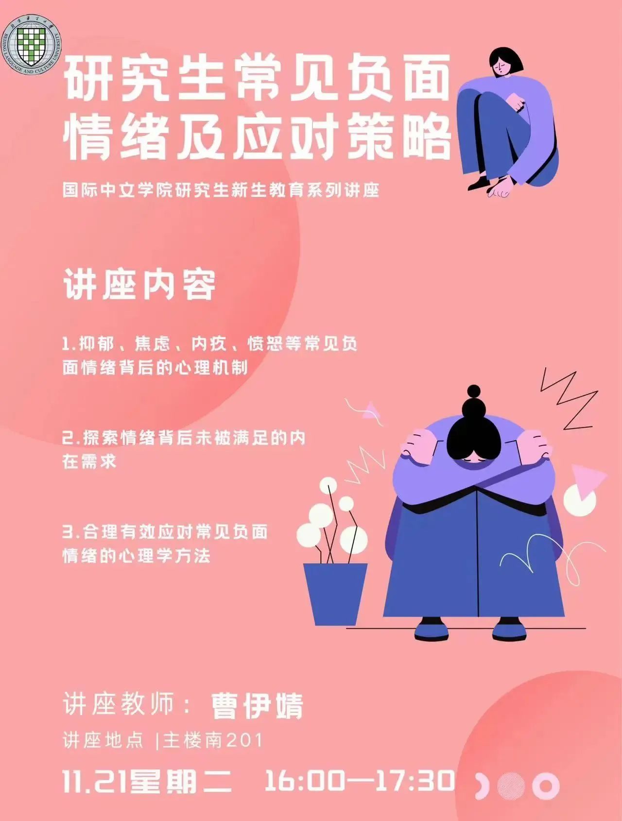 本次讲座我们邀请了曹伊婧老师,带领大家放下心中的包袱,敞开心扉,来一场内心的探索之旅。希望这次的讲座能给你带来一些启发和帮助。