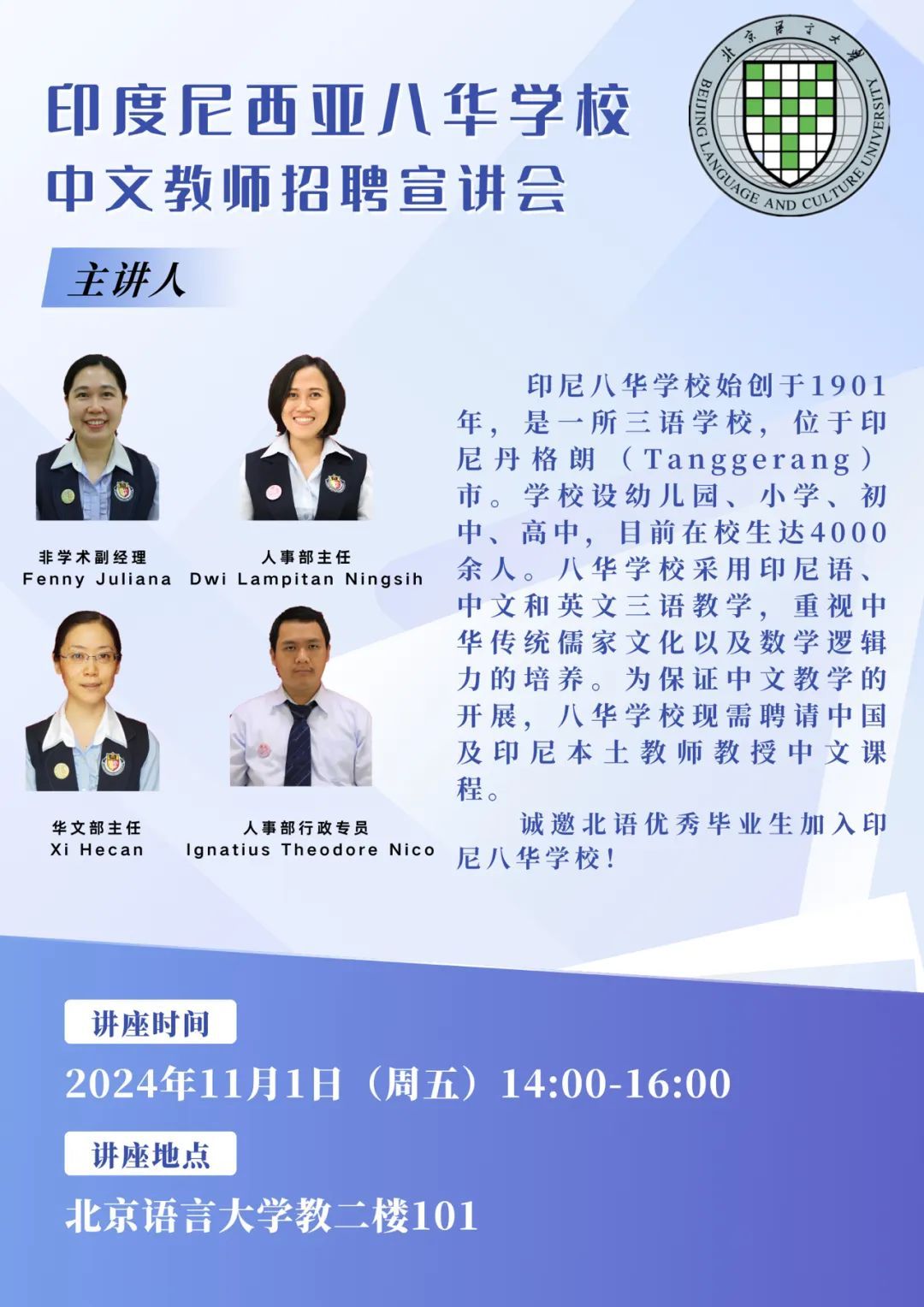 印尼八华学校始创于1901年,是一所三语学校,位于印尼丹格朗(Tanggerang)市。学校设幼儿园、小学、初中、高中,目前在校生达4000余人。八华学校采用印尼语、中文和英文三语教学,重视中华传统儒家文化以及数学逻辑力的培养。为保证中文教学的开展,八华学校现需聘请中国及印尼本土教师教授中文课程。诚邀北语优秀毕业生加入印尼八华学校!